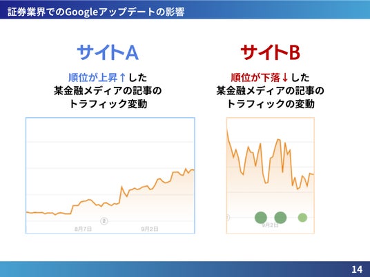 今回のアップデートは、特に証券業界において顕著な影響をもたらしました。金融関連の検索キーワードは、多くのユーザーにとって重要な情報源であり、サイトの順位変動が業界全体のトラフィックに大きな影響を与えています。