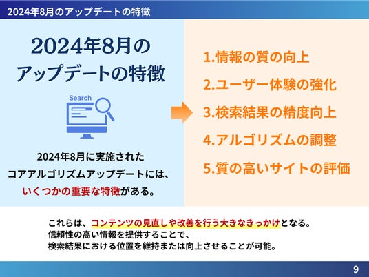 アップデート後の状況に基づいた評価や、その評価をもとにした効果的なアプローチについて言及しています。また、Googleのアルゴリズム変更に関連する基本的な知識や注意点についても触れています。
