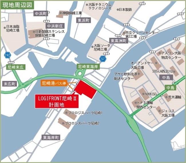 本施設は、大阪市中心街から10km圏内に位置し、阪神高速道路湾岸線「東海岸IC」から約1km、「中島IC」から約4km、阪神高速道路神戸線「尼崎東IC」・「尼崎西IC」から約5kmと交通利便性に恵まれた立地にあります。さらに、工業専用地域で物流倉庫として優れた操業環境であることなどに着目し、関西圏全体を網羅する広域配送の物流拠点とすべく、「LOGIFRONT」シリーズとして、本施設とともに「LOGIFRONT尼崎IV」、「LOGIFRONT尼崎III」の計3施設の開発を一体的に進めております。