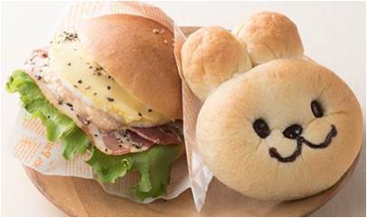 カリカリベーコンと目玉焼きをサンドし、オランデーソースを絞ったボリュームたっぷりのバーガーと、うさぎのキュートなあんぱん。