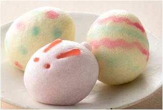 イースターエッグを模ったカラフルなまんじゅう!お子様向けのいちごあん、みるくあんを包みました。