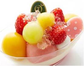 苺ソース、スポンジ、ミルクババロアを重ね、苺プリン&マンゴープリンをトッピング。
