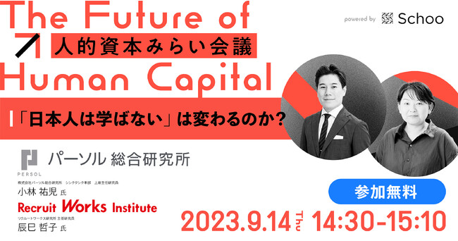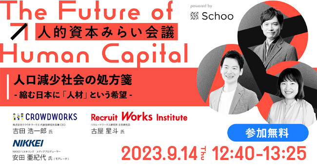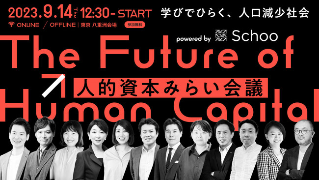 インターネットでの学びや教育を起点とした社会変革を行う株式会社Schoo(本社:東京都渋谷区、代表取締役社長CEO:森 健志郎、以下「スクー」)は、9月14日(木)に、「人的資本みらい会議 ~学びでひらく、人口減少社会~」と題したカンファレンスを開催します。人口減少社会の未来を切り開く鍵を「人への投資」と位置付け、同じ視点を持つ登壇者たちが集まって、参加者とともに語り考える参加型のミーティングです。