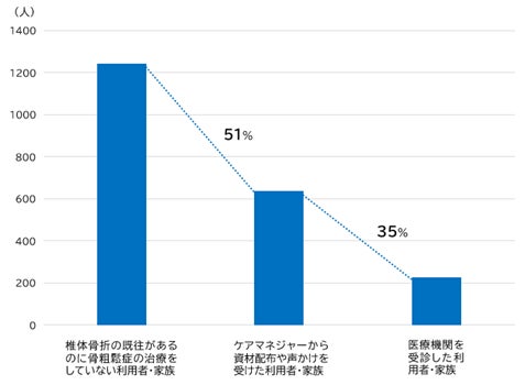 その結果、「椎体骨折の既往があるにもかかわらず、骨粗鬆症の治療をしていない」とケアマネジャーが認識している利用者・家族は1242人存在し、そのうち636人(51%)が資材配布や声かけを受け、さらに225人(35%)が医療機関を受診したと報告されました。