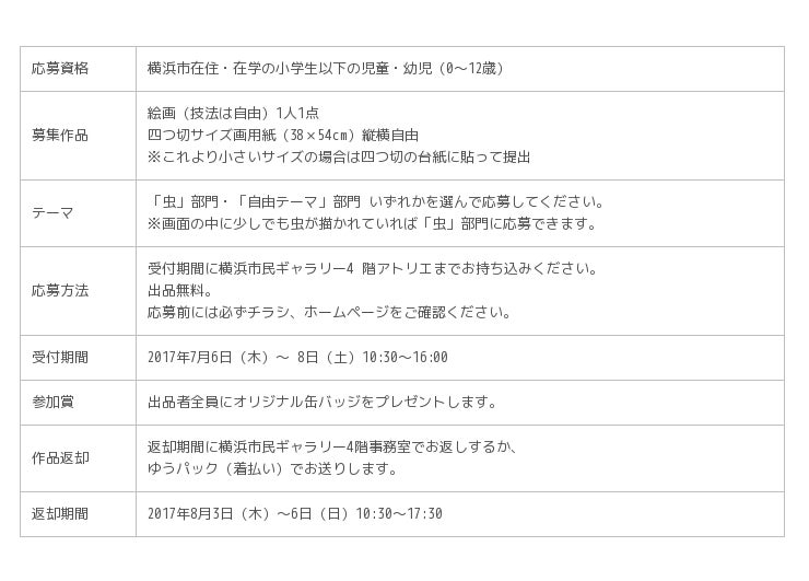 今年のテーマは「虫」。会場には虫の絵、虫の写真が勢ぞろい。「虫」を描いた絵画や、子どもたちが自由なテーマで描いた絵画を募集します。絵画に「作品カード」と「出品申込用紙」を添えて7月6日~8日に直接会場へ持ち込んで応募すると、全作品が7月21日~7月30日まで展示されます。昨年は3,326点の応募があり、子どもたちの元気な作品で会場がいっぱいになりました。