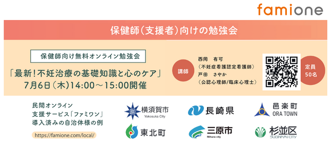 「子どもを願うすべての人によりそい 幸せな人生を歩める社会をつくる」をビジョンに掲げ、LINEを活用した妊活コンシェルジュサービス「famione(ファミワン)」 https://lp.famione.com/ を提供する株式会社ファミワン(本社:東京都渋谷区、代表取締役:石川勇介、以下当社)は、2023年7月6日に「保健師(支援者)向け無料オンライン勉強会」を開催します。