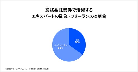 2023年にマッチングした「ビザスクpartner」の業務委託案件を分析したところ、各案件で支援に入ったエキスパートにおけるフリーランスと副業の割合は65%:35%という結果となりました。