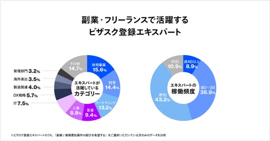 今回初めて、ビザスク登録エキスパートのうち「副業/業務委託案件の紹介を希望する」と登録されている方々の登録内容を分析したところ、新規事業開発、経営、マーケティングなど、企業活動の中枢で活躍できるハイレベルなエキスパートが非常に多い結果となりました。