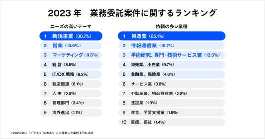 2023年にマッチングした「ビザスクpartner」の業務委託案件を分析し、どのようなテーマでの外部人材活用ニーズが高いのか、また、どのような業種からの依頼が多いのかをランキング形式で発表いたします。