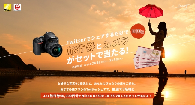 賞品:ニコンデジタル一眼レフカメラ「D3500 18-55 VR レンズキット」とJAL旅行券40,000円分のセット