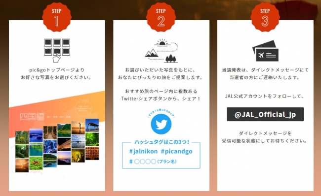 株式会社ニコンイメージングジャパン(社長:五代厚司、東京都港区)は、日本航空株式会社(以下「JAL」)とのコラボレーション第4弾となる、旅と写真をテーマにしたウェブサイト「pic&go(ピックアンドゴー)」の第2回「四国編」の公開を記念して、カメラと旅行券のセットを抽選で3名様にプレゼントする「Twitterでシェアするだけで旅行券とカメラがセットで当たる!キャンペーン 四国編」を2019年2月5日(火)より開始いたします。