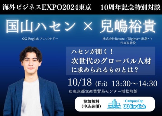QQEnglishアンバサダーの国山ハセンさんも特別対談ゲストとして登壇。「次世代のグローバル人材に求められるもの」をテーマに株式会社Resorz CEO兒嶋さんと対談いたします。