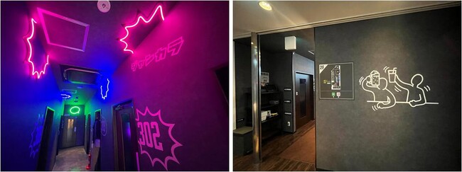 店内意匠はアニメーションをテーマにネオンの装飾やアニメーションタッチのイラストを施しております。