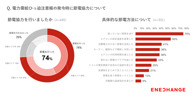 電力需給ひっ迫注意報発令時、対象エリア内外を含めて74%が節電に協力