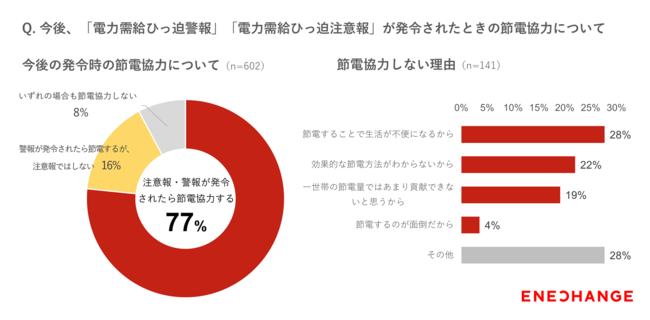 警報・注意報に関わらず、電力需給ひっ迫による節電要請が発令された際には、約8割が「節電に協力する」と回答しており、いずれの場合も「節電に協力しない」と回答した人は8%にとどまりました。節電に協力しない理由として、生活が不便になるや面倒だからと回答した人が32%といる一方で、その他(28%)の回答には、「普段から節電しているから」と「日ごろから電気の無駄遣いをしないよう心がけた生活しているのでこれ以上はできない」という声が多く見られました。