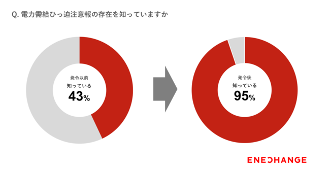 初回発令後に電力需給ひっ迫注意報の認知度は95%に増加