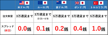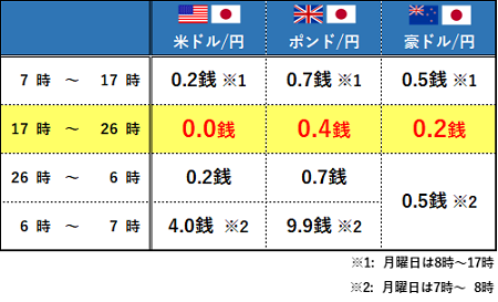 ※主要経済指標発表時等の急変時、国内外の休日や平日早朝など著しい流動性低下時はやむをえずスプレッドを拡大する場合がございます。 メンテナンス時間(火曜日~金曜日 各日5:55~6:10、土曜日5:50~月曜日7:00)は適用時間に含まれません。