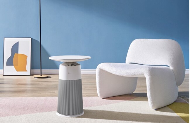 また、今年5月に行った、アタラシイものや体験の応援購入サービス「Makuake(マクアケ)」での先行販売で目標金額を、1389%達成した新製品、マルチ機能空気清浄機「LG PuriCare(TM) AeroFurniture」も展示します。「空気清浄機」としてだけでなく「サイドテーブル」、「ムードライト」、「ワイヤレス充電機」としても使える、4 in 1のマルチ機能を備えているだけでなく、世界トップクラスのプロダクトデザイン賞も複数受賞した、インテリアとマッチするスタイリッシュなデザインで、お部屋の雰囲気を格上げする、まったく新しいコンセプトの製品です。