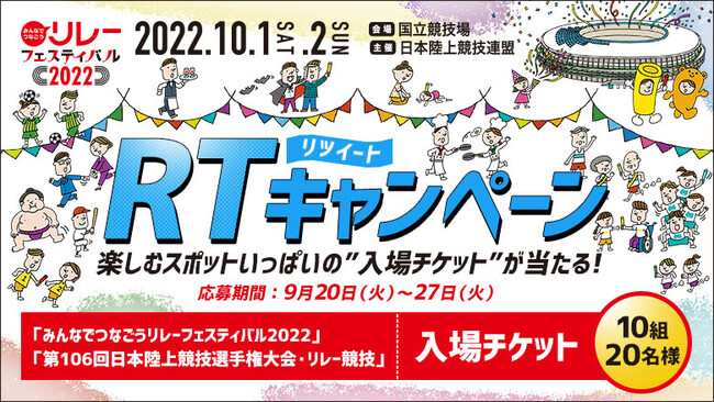 この度、リレフェス(併催:第106回日本陸上競技選手権大会・リレー競技)の入場チケットが当たるリツイートキャンペーンを実施いたします。