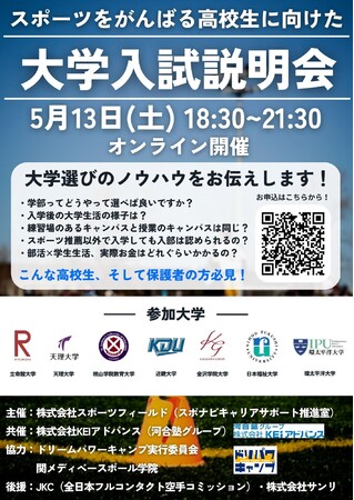体育会・スポーツ学生のための就職活動支援サイト「スポナビ」を運営する株式会社スポーツフィールド(本社:東京都新宿区 代表:篠崎 克志)は、5月13日に運動部学生の学びの支援等を行う河合塾グループの株式会社KEIアドバンスと共催で「スポーツをがんばる高校生に向けた大学入試説明会」を開催いたします。