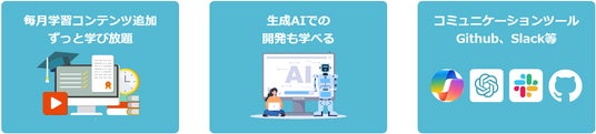 提供するコースは人気プログラミング言語ランキング(※2)で1位の言語「Python」、近年ビジネスの現場で急速に需要が高まっている「生成AI」などをご用意。生成AIを活用し、プログラミングの基礎からWeb開発・アプリ開発まで、未経験からITエンジニアになるためのスキルを身につけられます。さらにITの最新トレンドに合わせて新コースを順次スタート予定です。