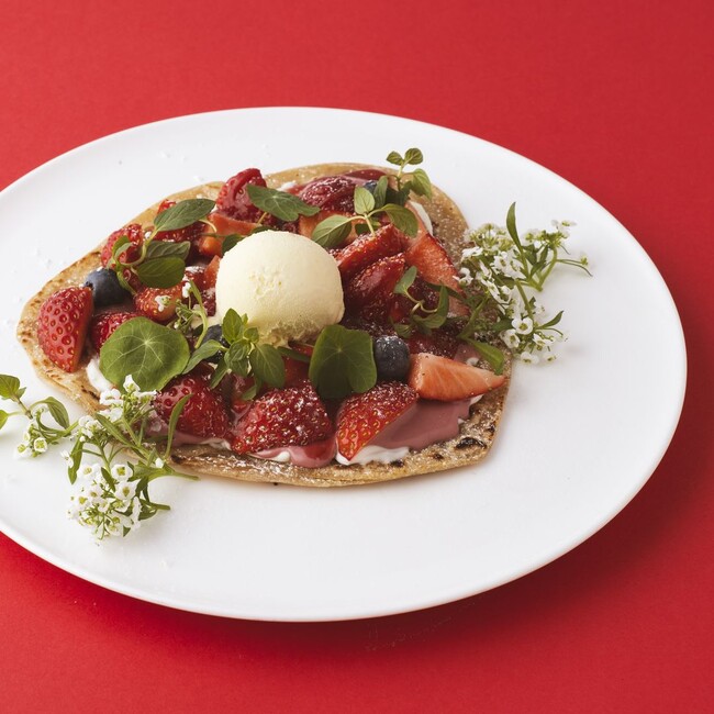 クレープのようなパラタ生地に、レアチーズムースとルビーチョコ、バニラアイス、甘みと酸味のバランスが良いよつぼしイチゴをトッピングしています。