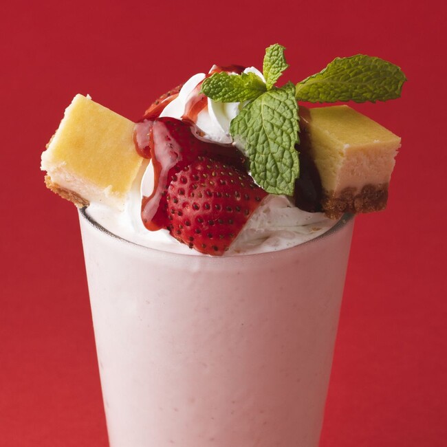シェイクの中にもストロベリーとチーズケーキを、トッピングにも新鮮なイチゴとガトーフロマージュを使用した、贅沢なシェイクです。