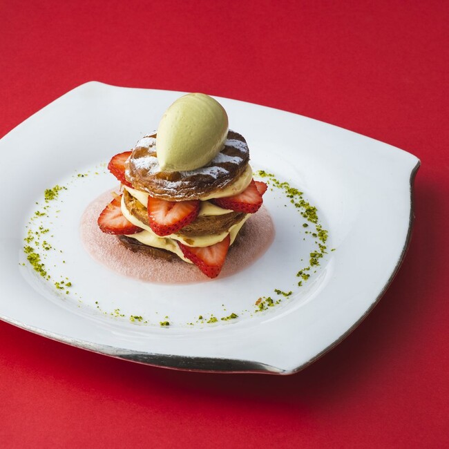 ピスタチオのアイスと苺の炭酸ソースを添えた贅沢なスイーツです。