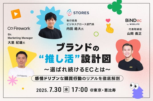 お店のデジタル化を支援する STORES 株式会社(以下、STORES)は、株式会社ウェブライフ(BiNDec)、Firework Japan株式会社と共催で、対面セミナー「ブランドの“推し活”設計図 ─ 選ばれ続けるECとは」を2025年7月30日(水)に開催します。