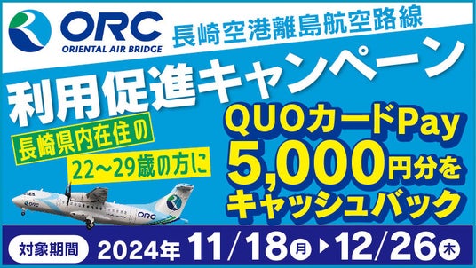 株式会社クオカード(以下当社、本社:東京都中央区、代表取締役社長:近田 剛)が展開するスマートフォンで使えるデジタルギフト『QUOカードPay(クオ・カード ペイ)』は、オリエンタルエアブリッジ株式会社が11月18日(月)より長崎県にお住まいの満22歳以上29歳以下の方を対象に開催する「長崎空港離島航空路線利用促進キャンペーン」で採用されました。本キャンペーンでは、長崎空港発着のORC離島路線を往復利用し、旅のようすをInstagramへ指定のハッシュタグをつけて投稿したうえで専用ページから申し込むと、一人5,000円分のQUOカードPayがプレゼントされます。