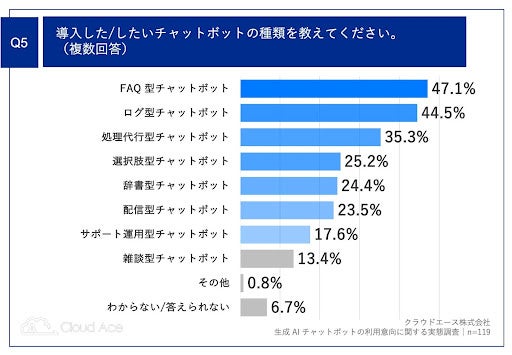 「Q5.導入した/したいチャットボットの種類を教えてください。(複数回答)」(n=119)と質問したところ、「FAQ 型チャットボット」が 47.1%、「ログ型チャットボット」が 44.5%、「処理代行型チャットボット」 が35.3%という回答となりました。