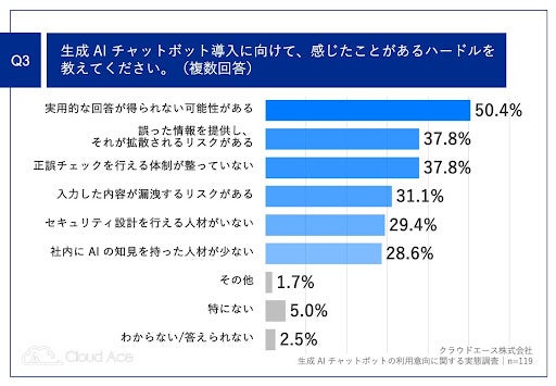「Q3.生成 AI チャットボット導入に向けて、感じたことがあるハードルを教えてください(複数回答)」(n=119)と質問したところ、「実用的な回答が得られない可能性がある」が 50.4%、「誤った情報を提供し、それが拡散されるリスクがある」 が37.8%、「正誤チェックを行える体制が整っていない」が 37.8%という回答となりました。