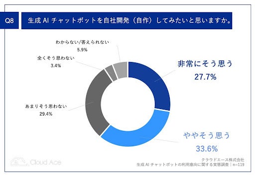 「Q8.生成 AI チャットボットを自社開発(自作)してみたいと思いますか。」(n=119)と質問したところ、「非常にそう思う」が 27.7%、「ややそう思う」が 33.6%という回答となりました。
