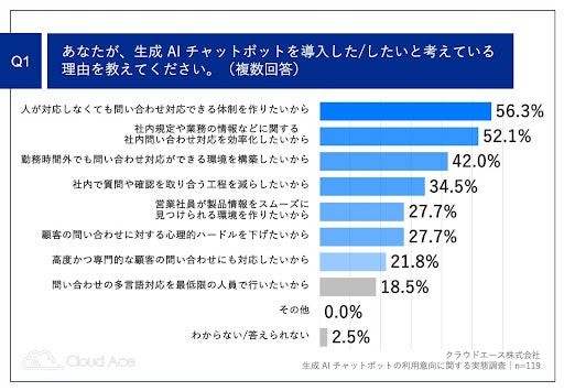 「Q1.あなたが、生成 A Iチャットボットを導入した/したいと考えている理由を教えてください(複数回答)」(n=119)と質問したところ、「人が対応しなくても問い合わせ対応できる体制を作りたいから」が 56.3%、「社内規定や業務の情報などに関する社内問い合わせ対応を効率化したいから」が 52.1%、「勤務時間外でも問い合わせ対応ができる環境を構築したいから」が 42.0%という回答となりました。