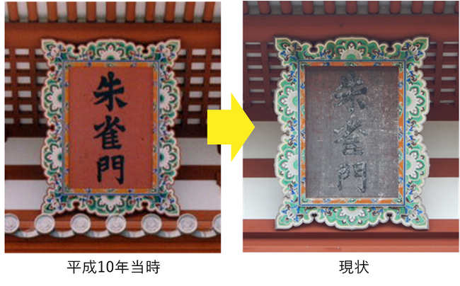 掲げられてから四半世紀、およそ25年が経ち、額面の退色が進んだことで、肝心の「朱雀門」の文字が読みづらくなっています。近年、朱雀門のすぐ南側には史跡公園が整備され、「朱雀門ひろば」がオープンするなどにぎわいを増しており、また「古都奈良の文化財」が世界遺産登録25周年を迎える節目の年でもあることから、市では扁額の修繕を計画し、その費用についてはガバメントクラウドファンディングにより、多くの皆さんにご協力をお願いすることにしました。
