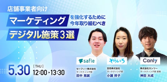 Googleビジネスプロフィール・HP・各SNSの一括管理サービス「カンリー」の開発・提供を行う株式会社カンリー(所在地:東京都品川区、代表取締役:辰巳 衛,秋山 祐太朗)は、空色株式会社 ・セーフィー株式会社と2024年5月30日(木)に無料セミナー「マーケティングを強化するために今年取り組むべきデジタル施策3選」をオンライン開催いたします。