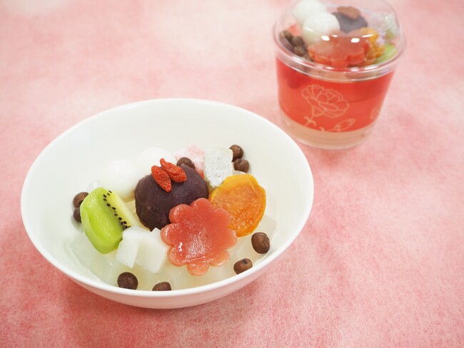 カーネーション型の苺寒天やあんず等を添えた母の日のオリジナルあんみつ。昔ながらの製法で作った寒天をはじめ、身体にやさしい和スイーツです。