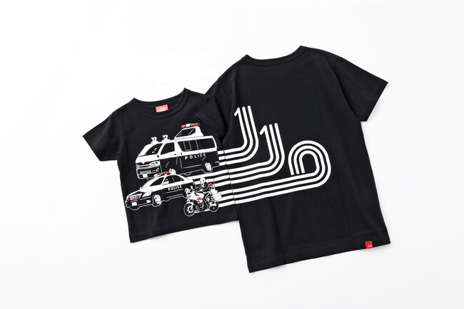 警察車両が大集合したデザイン。お揃いで着ると絵柄が繋がる、親子や兄弟のペアルックがおすすめのアイテムです。