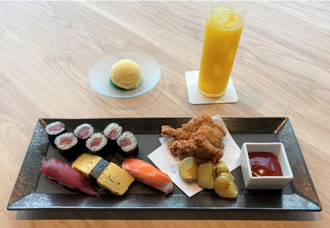 握り鮨3貫、巻物、ポテト、唐揚げ、ジュースにアイスクリームまでが付いたお子さまも大満足なお得なセットです。