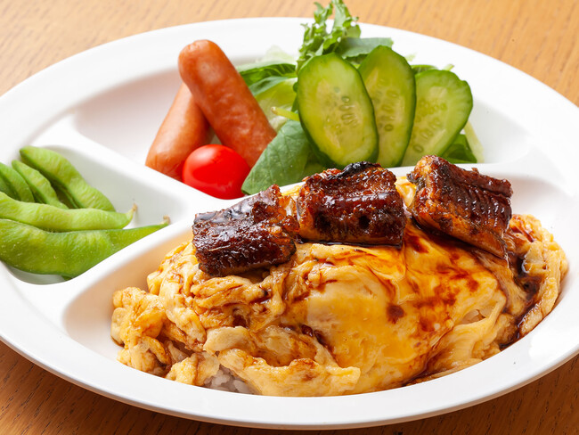 うなぎをのせたオムライスにサラダやデザート、ドリンク付きのお子さま限定のワンプレートです。