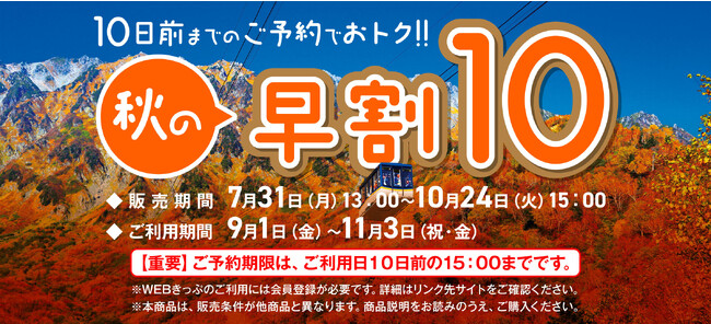 立山駅発・扇沢駅発の乗車予約ができ、自動受取機でラクラク受け取りができる、大変便利なきっぷです。早期予約でお得なきっぷ「秋の早割10」も10月24日まで販売中!詳細は以下でご確認ください。