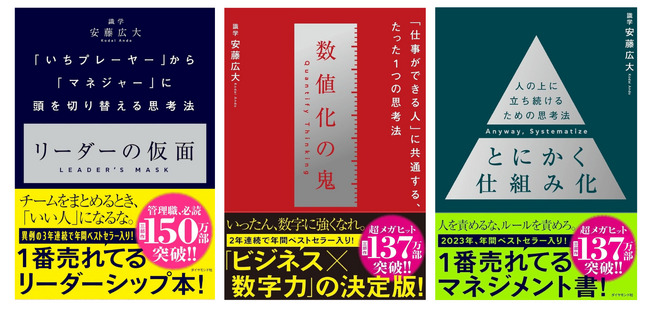 2021年、2022年、2023年の3年連続で1番売れたリーダーシップ本(※1)の『リーダーの仮面』、2022年、2023年の2年連続で1番売れたビジネススキル本(※2)の『数値化の鬼』、そして2023年に1番売れたマネジメント本(※2)の『とにかく仕組み化』の3冊は、若手社員から経営者まで全ビジネスパーソンの必読書として多くの反響を集め、累計150万部を突破したビジネス書シリーズです。社員研修や管理職育成などを目的に企業で採用されるケースも多く、個人だけではなく会社や組織の成長や課題解決に寄与し、悩み・葛藤する日本全国のビジネスパーソンの背中を押しています。