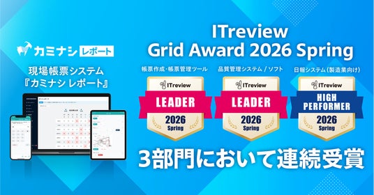 株式会社カミナシ(本社:東京都千代田区、代表取締役:諸岡 裕人、以下「カミナシ」)が提供する現場帳票システム『カミナシ レポート』は、アイティクラウド株式会社(本社:東京都港区、代表取締役社長兼CEO 黒野源太、以下「アイティクラウド」)が主催する「ITreview Grid Award 2026 Spring」において、「帳票作成・帳票管理ツール」部門で最高位の「Leader」を8期連続、「品質管理システム/ソフト」部門で同じく最高位の「Leader」を7期連続、そして「日報システム(製造業向け)」部門で「High Performer」を7期連続で受賞しました。