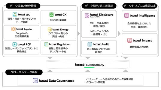 *2 サステナビリティERP(booost Sustainability)は、自社およびサプライヤーのサステナビリティ関連財務情報を管理する“統合型SXプラットフォーム”です。国際開示基準に準拠した環境、社会、ガバナンス等の1,200以上のデータポイントに対応したサステナビリティ関連情報の収集、集計を自動化し、リアルタイムでのモニタリングを可能にします。グローバルに対応したデータガバナンス機能を搭載しており、グループやサプライチェーンを含む組織において多階層の承認フローの実装が可能であるほか、第三者保証等にも対応すべく設計したプラットフォームであり、サステナビリティ関連情報の開示に向けて発生する各業務を効率化・最適化する機能をフェーズ毎に包括的に提供しています。提供開始以降、計95カ国以上、約6,500社197,000拠点以上(2025年12月時点)に導入されています。