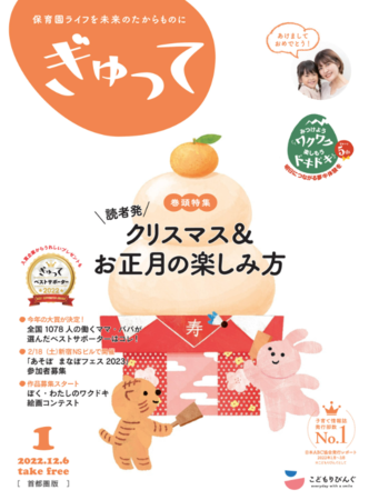 全国私立保育園連盟をはじめ、協議会・団体・行政の承認・協力を得て、毎月1回(地域により異なる)、首都圏・関西圏・東海圏の保育園で計約35万配布しています。独自の編集方針で保育園や園児とその保護者から信頼を得ることをモットーに、仕事と 子育ての両立、時短など働くママ・パパの気持ちに寄り添う特集、連載を展開しています。https://gyutte.jp/magazine