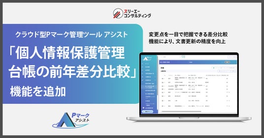 Pマーク、 ISOコンサルにおける支援実績 No.1(注1)のISO/Pマークの取得・運用支援サービス「認証パートナー」を提供する株式会社スリーエーコンサルティング(本社:大阪府大阪市、代表取締役社長:竹嶋 寛人)は、このたび、当社が提供するクラウド型Pマーク管理ツール『Pマークアシスト』において、「個人情報保護管理台帳の前年差分比較」機能を新たに追加いたしました。