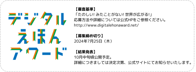 審査基準は「楽しい!」「見たことがない!」「世界が広がる!」。応募締め切りは2024年7月25日(木)までとなっております。こどもから大人まで応募可能となっておりますので是非ご応募ください。エントリー方法は公式サイト(http://www.digitalehonaward.net/)にてご確認ください。
