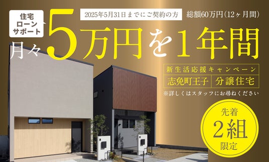 先着2組限定キャンペーン|5月31日までのご契約で、月々5万円×1年間の住宅ローンサポート!