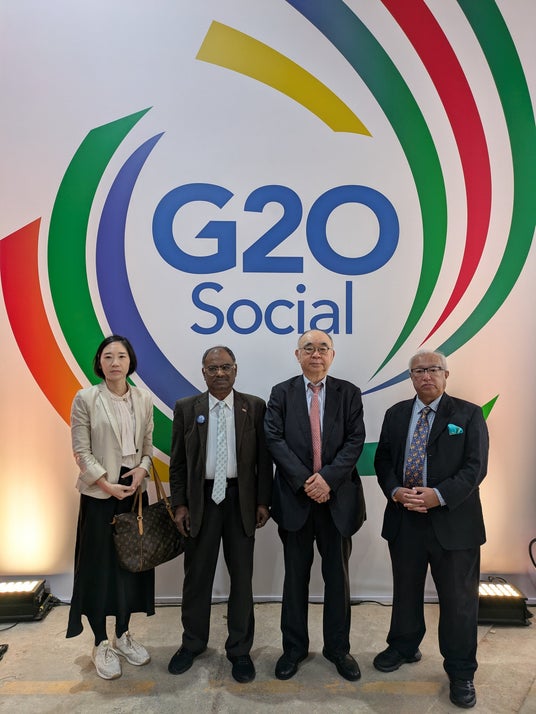 武蔵野大学国際総合研究所(所長:西村 英俊)は、2024年5月より「グローバルサウス研究会」を実施し、グローバル・サウス台頭による新たな国際秩序の基本的方向性を示すビジョンの策定を進めてきました。その結果として、取りまとめられた政策提言集「悉皆成長のための多様性経路」を今回、11月11日、12日のT20(G20に併催されるシンクタンクの協議体)サミットにおいて配布・説明し、11月13日のT20サイド・イベント・セミナー(A High-level T20 side event reflecting Global South Aspirations : Innovative Strategies for Disaster Resilience)、11月14日のG20 Social Summitにおいて、「Fortifying Global South Economies through Dynamic Governance Solutions」のテーマで発表・討議しました。その後、前議長国インドのG20シェルパ(首席政府代表)であるH.E. Amitabh Kant氏、ブラジル駐箚インド特命全権大使H.E.Suresh Reddy氏等と本報告書に関する協議を行いました。11月15日には、議長国ブラジルのG20シェルパを通じて、参加国のG20シェルパ全員に報告書40冊を配布し、情報共有を行いました。