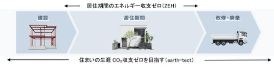 「earth-tect(※3)」は自社製品由来の再生可能エネルギー電力及び環境価値を活用し、60年をかけて住宅の生涯CO2収支ゼロ(※4)を目指しており、カーボンニュートラル実現に貢献できる戸建住宅です。それと同時に重鉄制震構造のヘーベルハウスが持つ耐震性・耐火性・耐久性に大容量の太陽光発電と蓄電池を組み合わせることで、停電時でも在宅避難が可能な電力を確保するなど、長く安心して住み続けられるレジリエンス性も兼ね備えています。